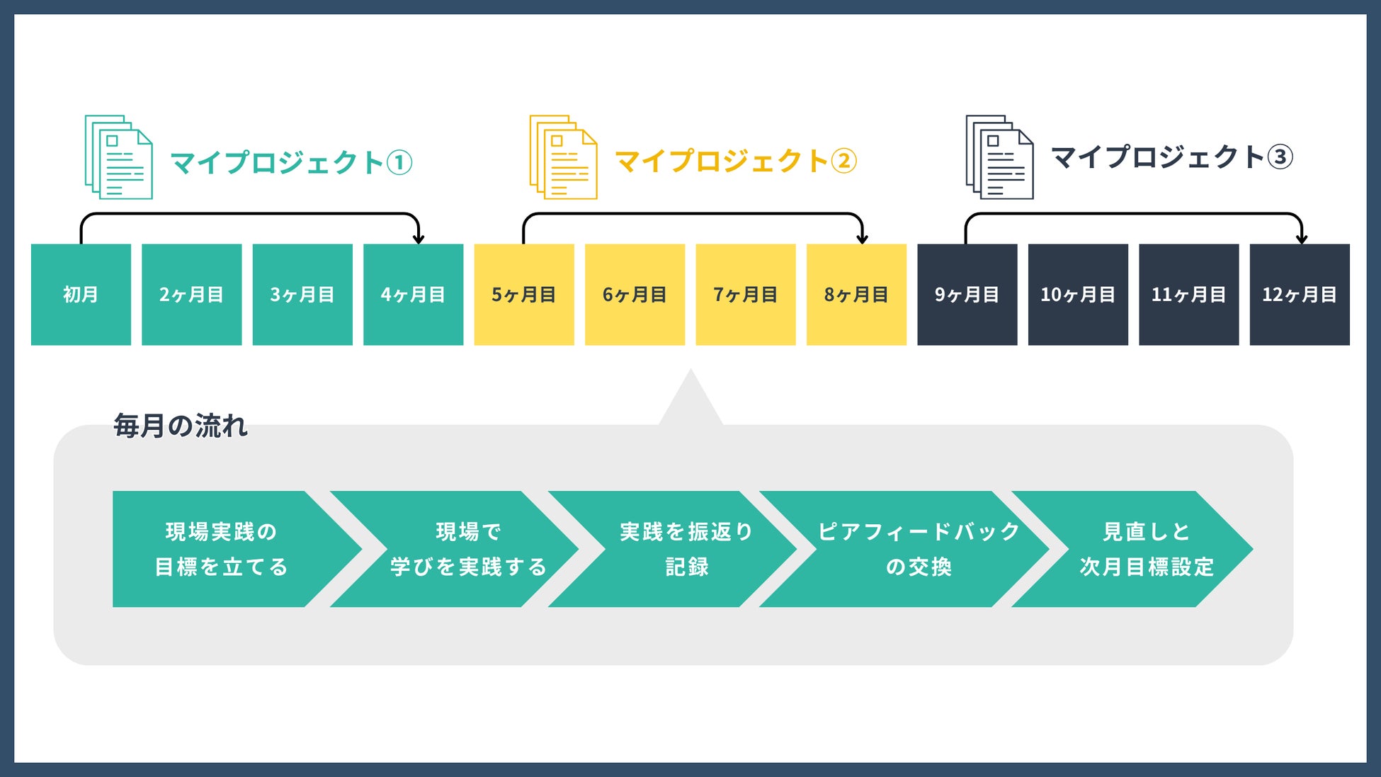 受講者は自らの現場課題を「マイプロジェクト」として設定し、毎月実践→記録→フィードバック→振り返りを繰り返します。研修が「一度きりのイベント」ではなく、現場で学び続ける仕組みへと変わります。