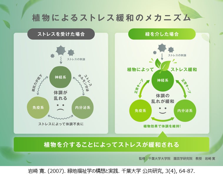 ストレスを受けると、私たちの体では神経系に大きな影響が現れ、それが免疫系や内分泌系にも波及することで、抵抗力の低下やストレスホルモンの分泌異常など、様々な体調不良を引き起こすことがあります。しかし、植物を介した場合は、植物が神経系に作用し、免疫系・内分泌系との関係性を正常に保つことで、ストレスによる体調の乱れを防ぎ、健康な状態を維持する効果が期待できます。このように、植物を介することでストレスが緩和されることが、科学的にも実証されています。