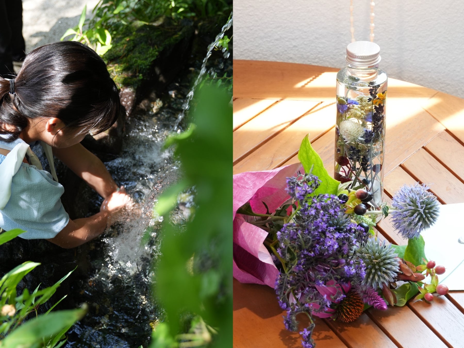 植物の生命力が溢れ、北アルプスの雪解け水が流れるガーデンを散策します。植物や水に触れ五感からの癒しを感じます。