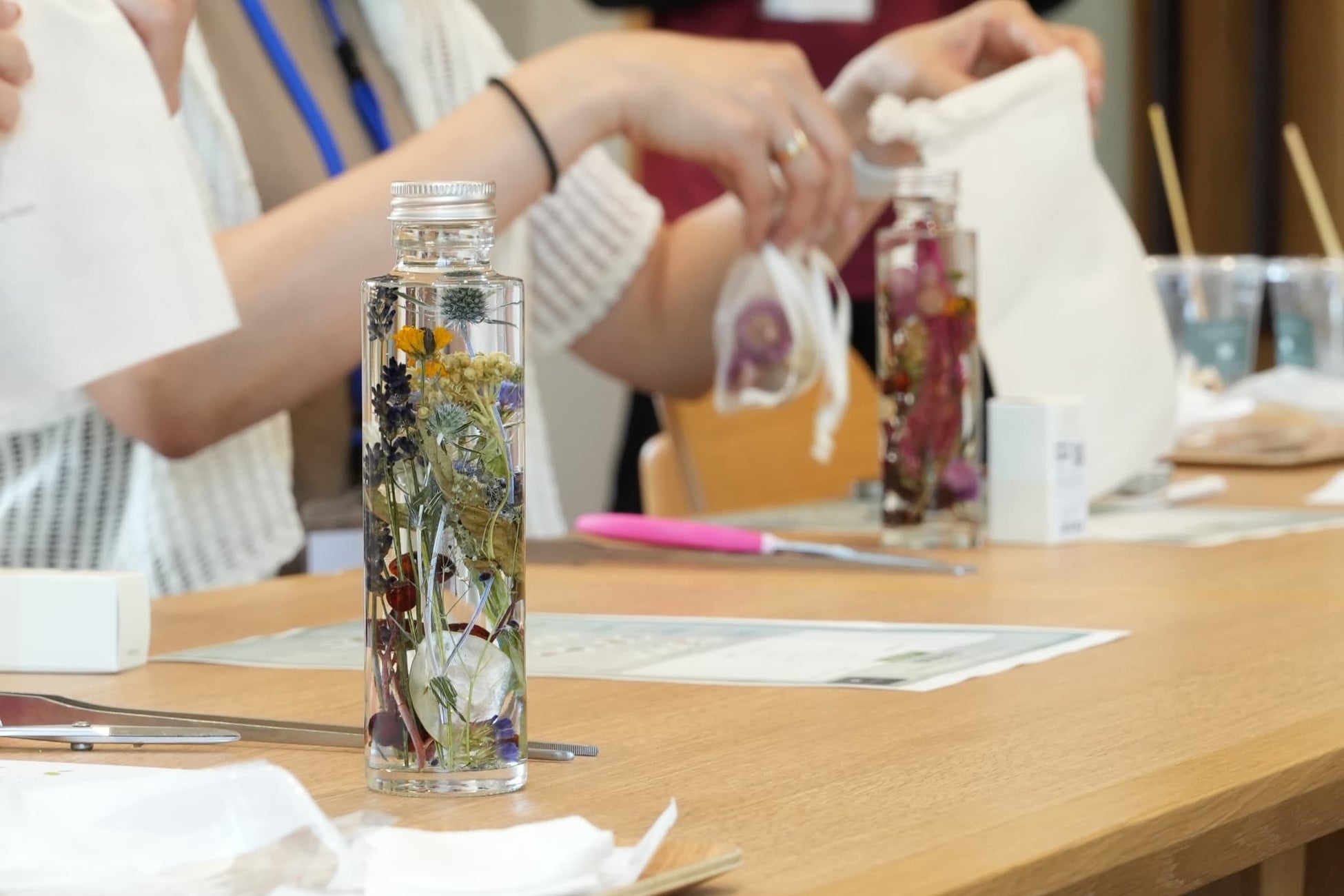 本発表会には、アルペンローゼからは、ラ・カスタ ブランドマネージャー 石井 智子とガーデンディビジョン長 山下 尚子の2名、そして本プログラムの監修を務めた千葉大学 大学院園芸学研究院 岩崎 寛教授が登壇し、本プログラムの開発背景やプログラムの詳細についてお話しいたしました。また、実際にハーブに触れて香りを楽しむ体験や、ハーバリウムづくりの体験もおこないました。