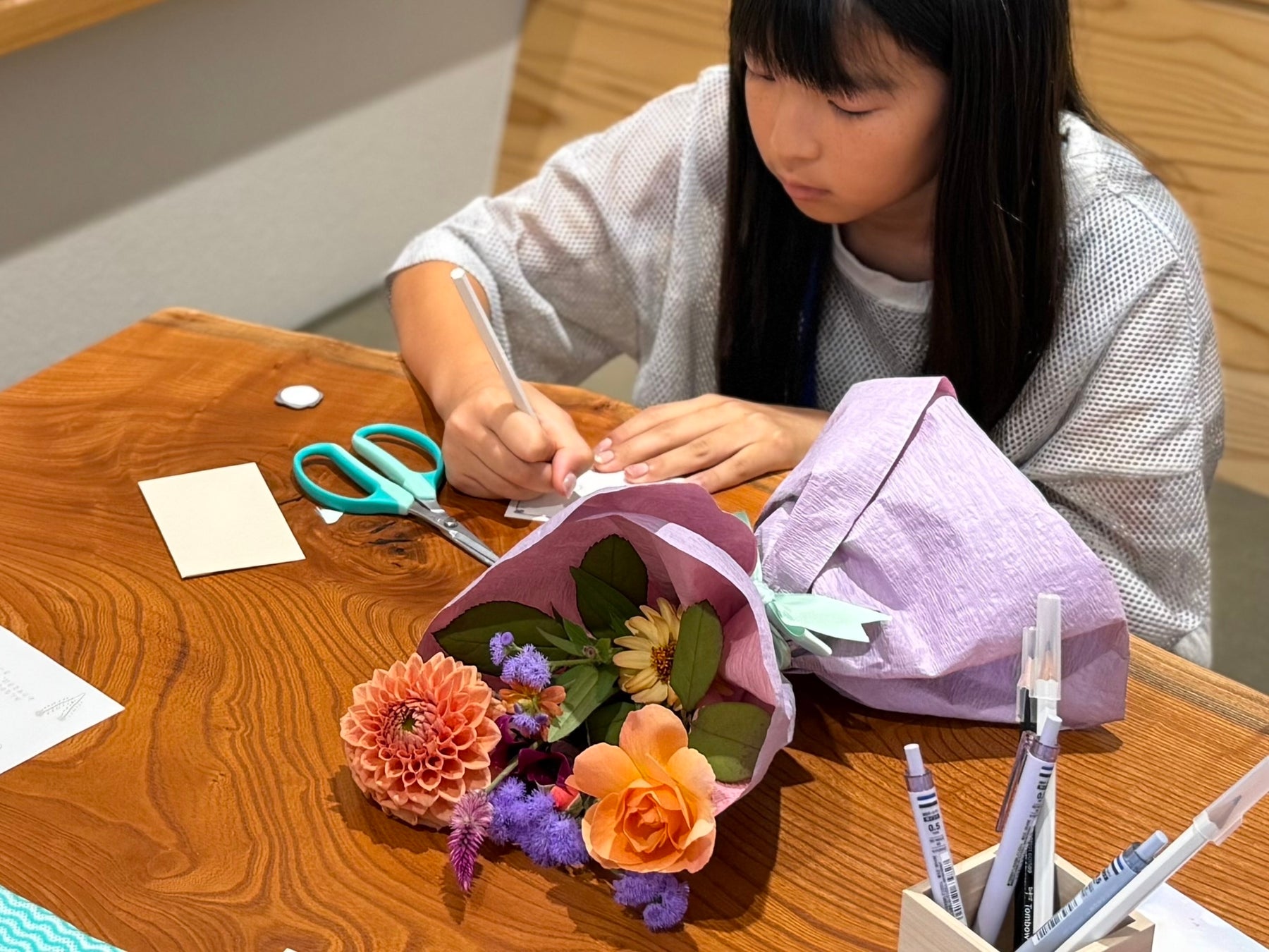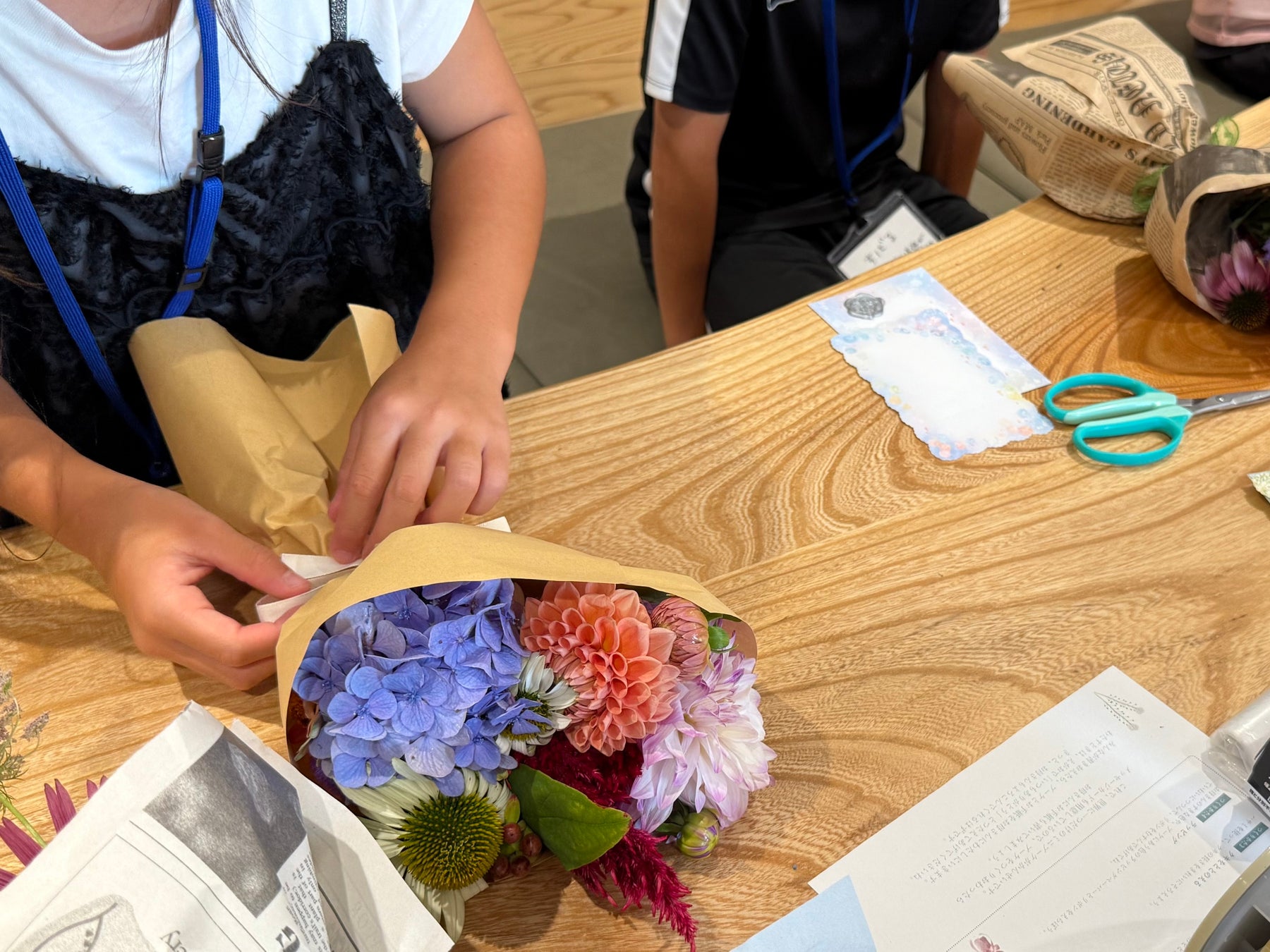 お子さんは、親子プログラムで摘んだ植物を使ってミニブーケづくりを体験します。ご自身や親御さんが好きな花に沿える葉っぱや包装紙、リボンなどを選びながら、オリジナルブーケを作ります。