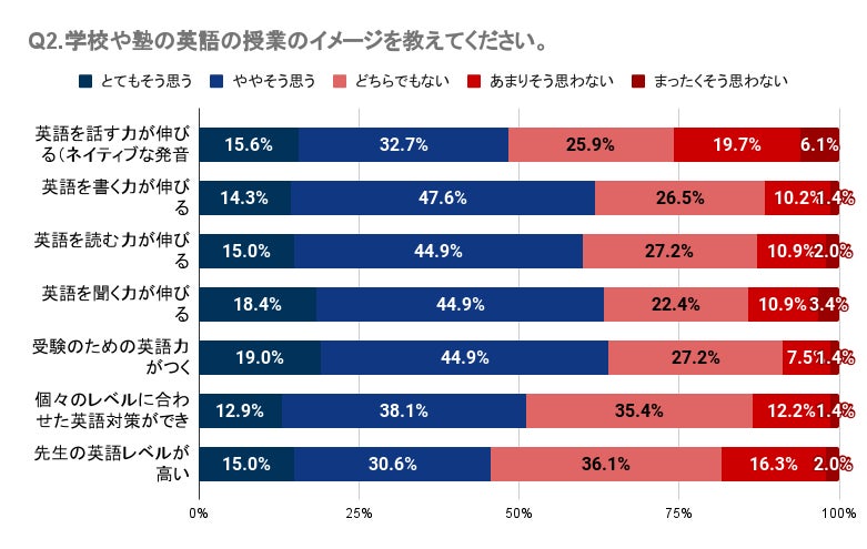 Q1・Q2では、子どもが英会話スクールや英語塾に通っていたが英語力アップの効果を感じていない人が一定数いること、学校や塾の英語の授業に対して明確な効果や良い印象を持てていない人が多いことが明らかになりました。