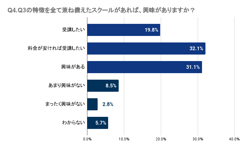 Q4で「Q3の特徴を全て兼ね備えたスクールがあれば、興味がありますか?」と質問したところ、徳島県では19.8%が受講を希望し、32.1%は料金が手頃であれば受講したいと考えています。さらに、31.1%は興味を示していると回答しました。多くの人がこのような特徴を持つスクールに一定の興味を示していることが分かります。