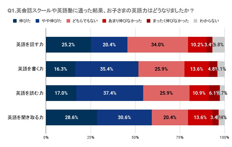 Q1で「英会話スクール、英語塾に通った結果、お子さまの英語力はどうなりましたか?」と質問したところ、徳島県では英会話スクールや塾に通って英語のスキル向上を明確に感じられなかったと感じている人が一定数いることが分かりました。具体的には、英語を話す、書く、読む、聞き取る各スキルにおいて、「伸びた」と感じる人は16.3%~28.6%であり、一方で「あまり伸びなかった」や「まったく伸びなかった」と回答した人が合わせて13.6%~18.4%となっています。特に、「英語を話す力」と「英語を書く力」においては「あまり伸びなかった」と「まったく伸びなかった」の合計がそれぞれ13.6%、18.4%となっています。また、各スキルに関して「どちらでもない」と答えた人も含めると、37.4%~47.6%となっており、明確な効果を実感していない人が一定数存在することが伺えます。