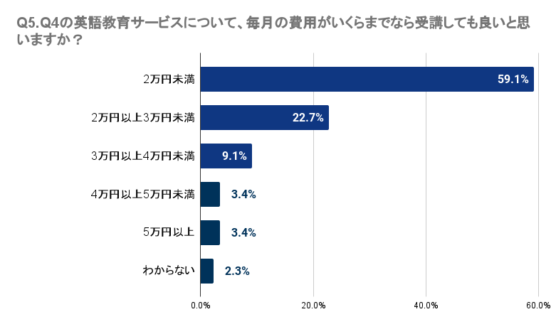 Q4で「受講したい」「料金が安ければ受講したい」「興味がある」と回答した人に、Q5で、「Q4の英語教育サービスについて、毎月の費用がいくらまでなら受講しても良いと思いますか?」と質問したところ、最も多い59.1%の回答者は2万円未満が適切と感じています。22.7%は2万円以上3万円未満、9.1%は3万円以上4万円未満と答えました。対照的に、4万円以上の費用を考える回答者は極少数で、4万円以上5万円未満と5万円以上が3.4%でした。これにより、徳島県では多くの人が3万円未満の価格帯を望んでいることが明らかとなりました。