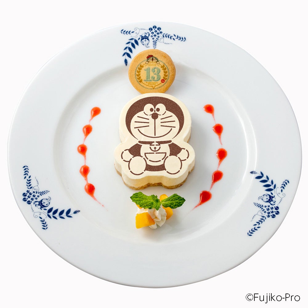 ドラえもんをかたどった、なめらか食感のチーズケーキです。ココアパウダーでドラえもんを表現しています。13周年ロゴのクッキーつき!