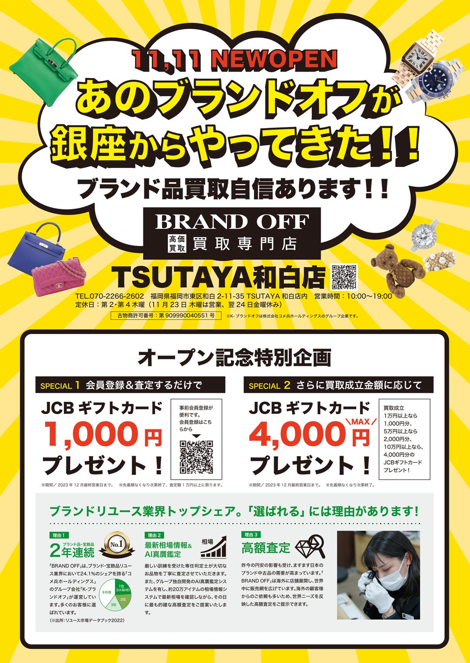 「BRAND OFF 買取専門 TSUTAYA和白店」が福岡県福岡市に11月11日(土)オープン