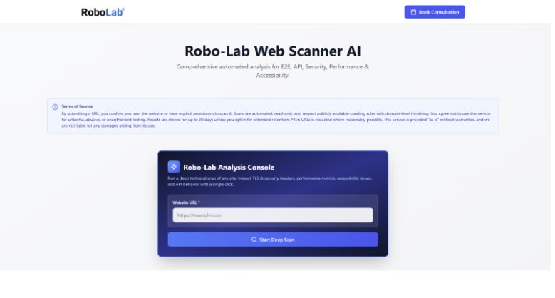 AI WEB ANALYZER is now available online. Enter any URL to receive a full diagnostic report in minutes, including a composite overall score and AI-generated recommendations. Users can also receive the full report by email or book a consultation with Robo Lab to get expert help acting on the results.