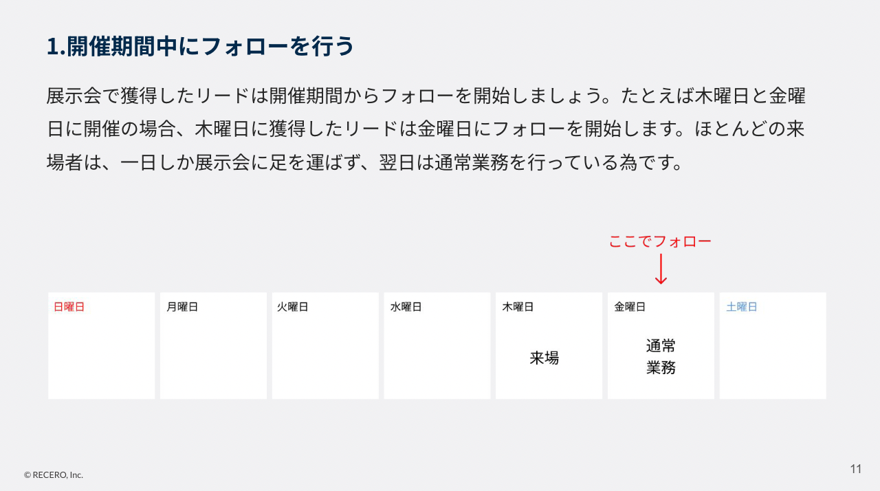「 展示会で商談化率を高めるために実施したインサイドセールス施策」のスライドでは、展示会で獲得したリードを商談に繋げるための具体的なアクションや手法をまとめています。
