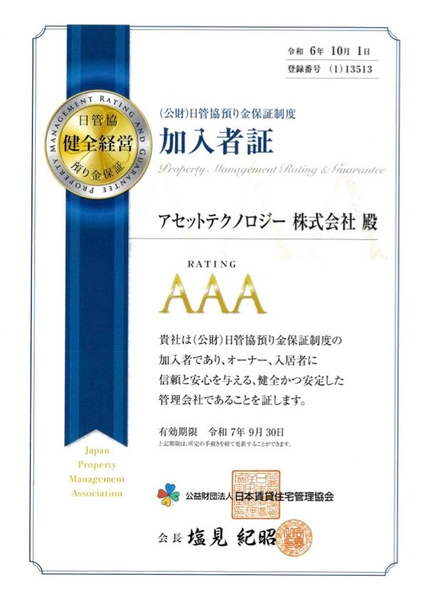アセットテクノロジー株式会社(本社:⼤阪府⼤阪市、代表取締役:宮本泰光、https://assettech.co.jp/、以下 アセットテクノロジー)は、公益財団法人日本賃貸住宅管理協会(略称:日管協、所在地:東京都千代田区、会長:塩見紀昭)が提供する「預り金保証制度」に加入いたしましたので、お知らせいたします。