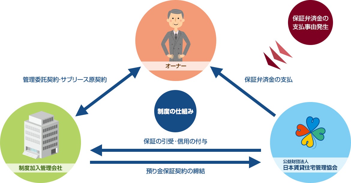 ※本制度の「オーナー」とは、居住用の賃貸物件について、本制度に加入する管理会社と賃貸管理受託契約またはサブリース原契約を締結している建物所有者をいいます。