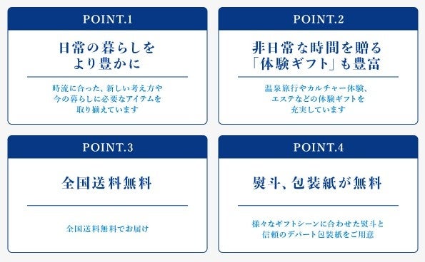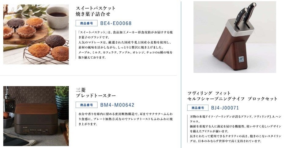 「ファッション」「インテリア」「グルメ」など、選びやすいカテゴリー別に商品を掲載。世界の有名ブランドや日本全国の名産品を特集し、温泉旅行やカルチャー体験、エステなどの体験ギフトも充実しております。