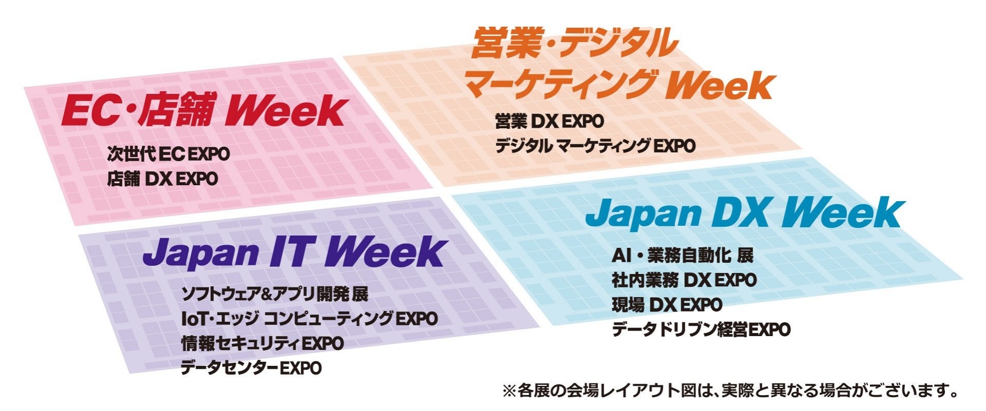 【Japan IT Week】【Japan DX Week】【営業・デジタルマーケティング Week】【EC・店舗 Week】の4つの展示会で構成される、日本最大のIT・DX総合展です。日本全国をはじめ、世界各国から来場者が訪れ、ビジネスマッチングが行われています。