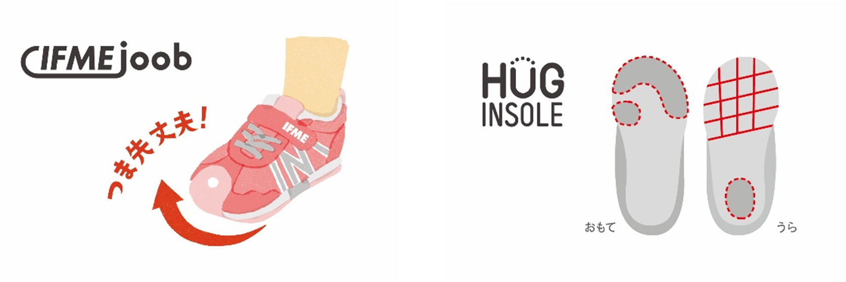 「IFME Joob」は、活発に遊ぶお子様のためにつくられた、IFMEのオリジナル機能。ソールを巻き上げてつま先を補強することで、つまずきなどの衝撃に耐え、“丈夫”で長持ちするつくりが特長です。