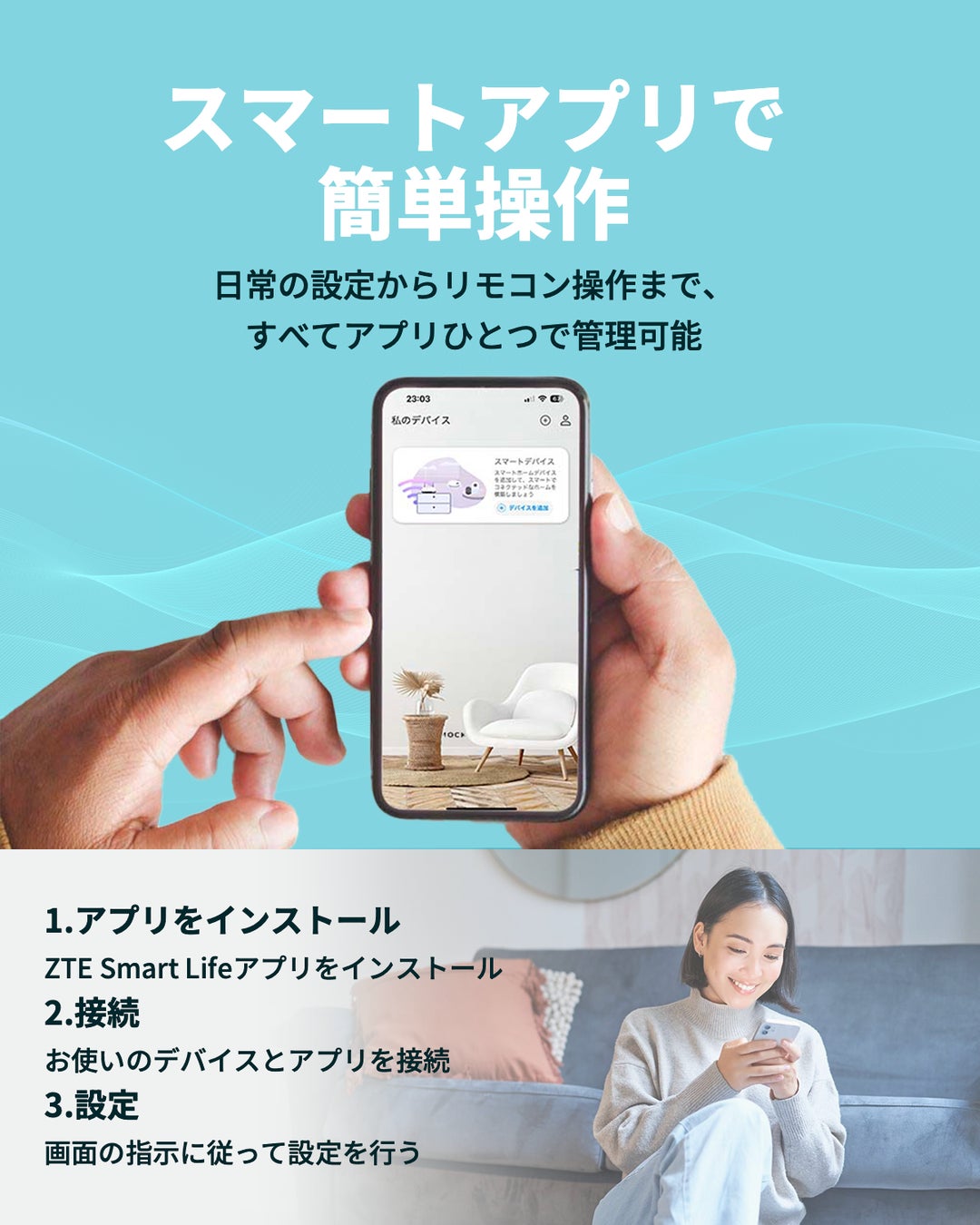 日本語に対応した専用アプリ「ZTE Smart Life」を使うことで、通信状況の確認や、ペアレンタルコントロールを利用したお子さまのインターネット利用に関する詳細な設定を、簡単に行うことができます。