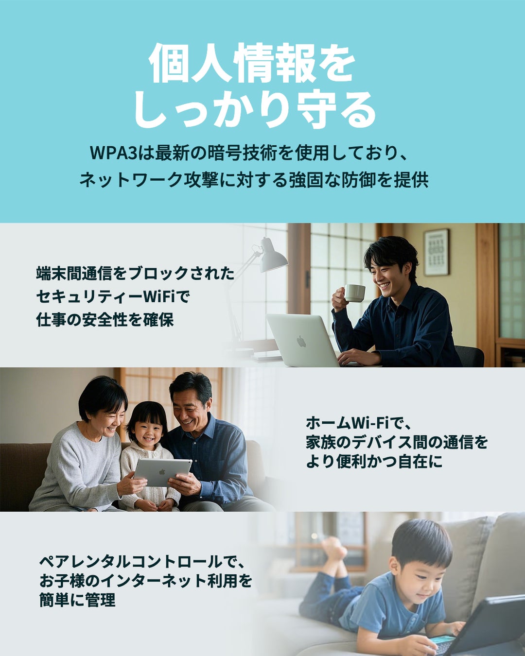 標準搭載の高性能ファイアウォールが、外部の脅威からご家庭のプライバシーを守ります。また、最新のWPA3暗号化技術により、Wi-Fi不正接続を防止し、快適かつ安全なインターネット環境をお届けします。