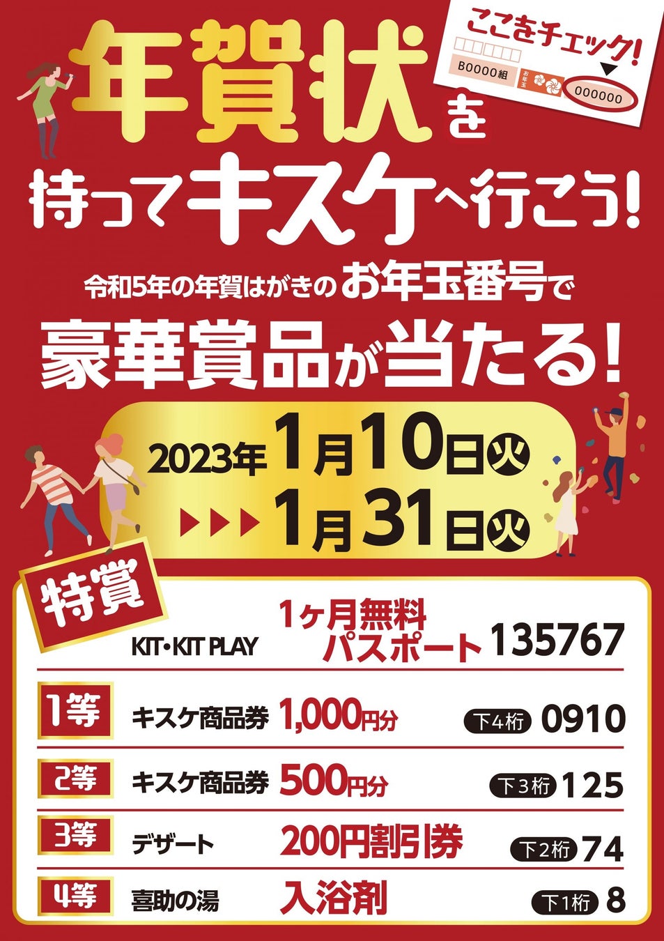 四国最大級の総合エンターテイメント企業・キスケ株式会社(本社:愛媛県松山市、代表:山路義則)は、2023年1月10日~1月31日までの期間、「伊予の湯治場 喜助の湯」(愛媛県松山市)・「しまなみ温泉 喜助の湯」(愛媛県今治市)・キスケKIT/キッズパークKIT PLAY(愛媛県松山市)で、年賀状のお年玉番号を使ったキャンペーンを開催中。