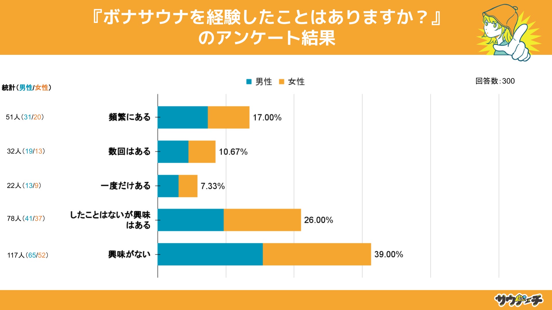 10代〜30代男女を対象とした「ボナサウナを経験したことはありますか?」というアンケートで最も多かった回答は「興味がない」で39%でした。