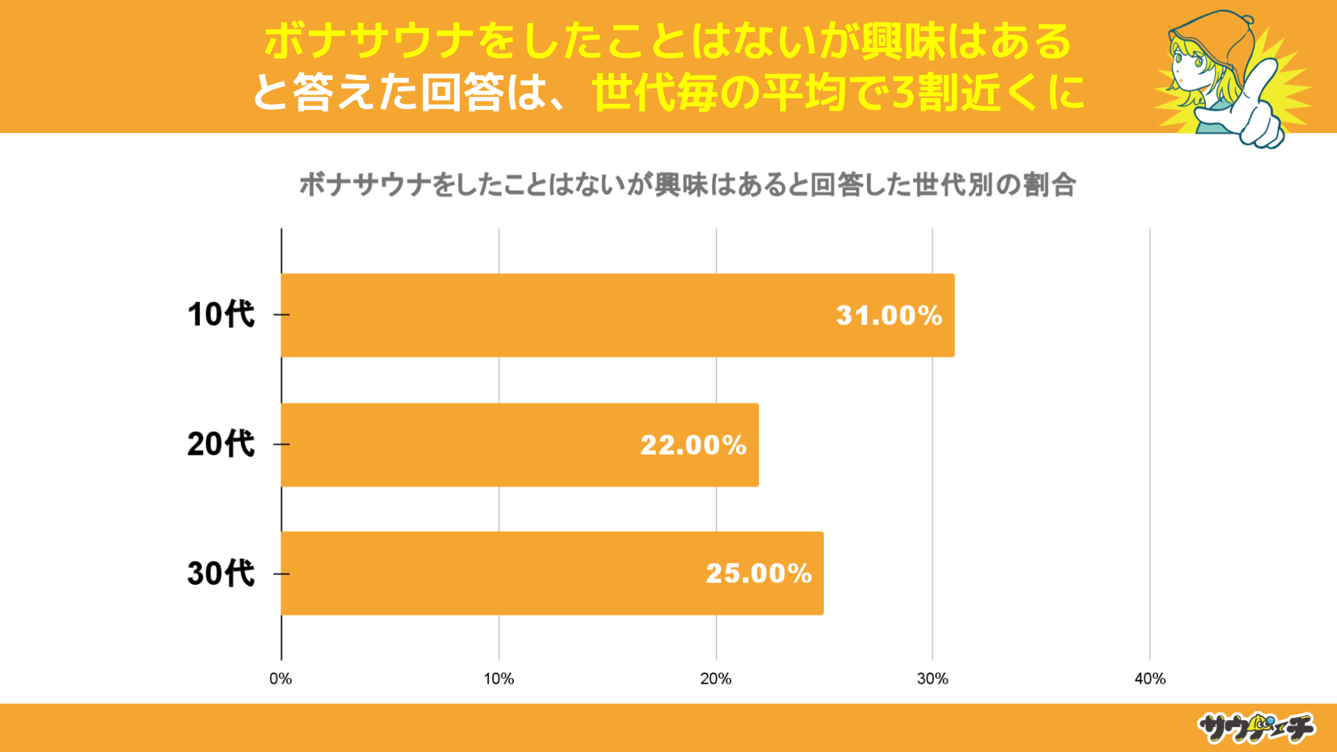 【ボナサウナをしたことはないが興味はあると答えた回答は、世代毎の平均で3割近くに】