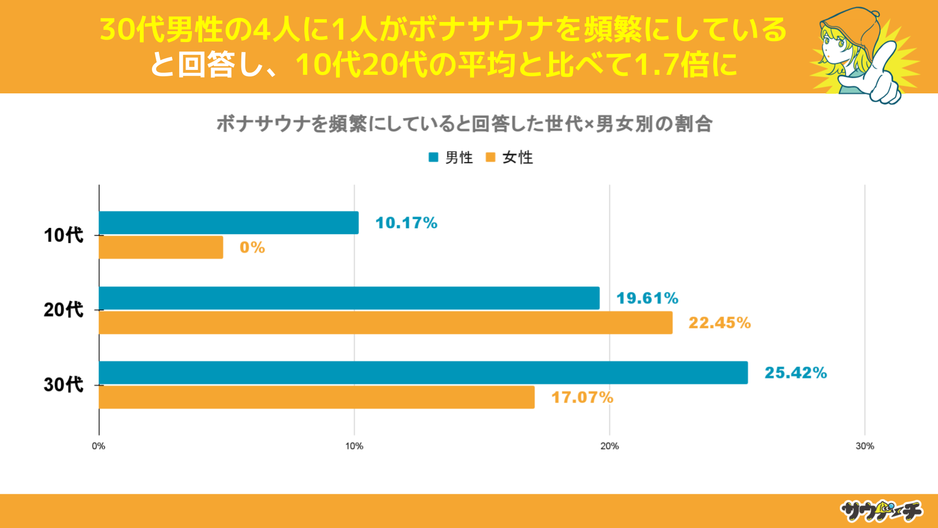 【30代男性の4人に1人がボナサウナを頻繁にしていると回答し、10代20代の平均と比べて1.7倍に】