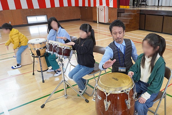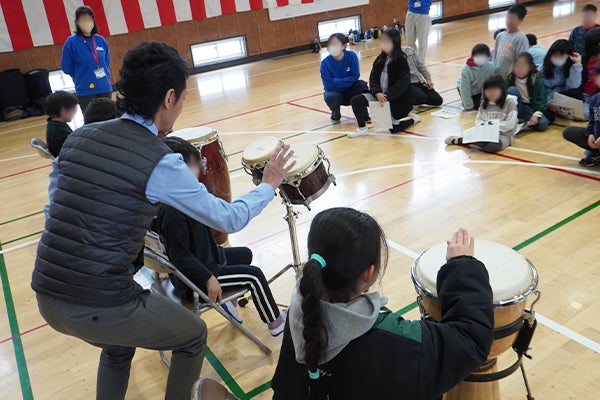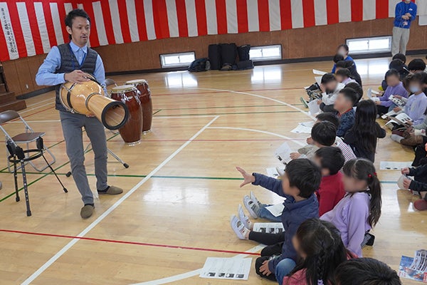 その後、子どもたちにそれぞれの楽器の叩き方をレクチャーし、子どもたちにも実際に叩いて音を出してもらいました。