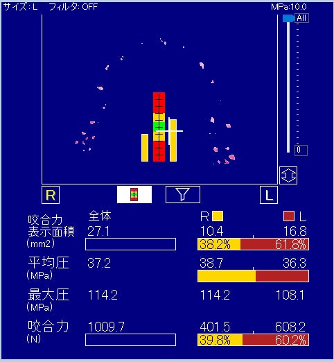 ▼噛むチカラ測定結果 ①:咬合力【単位:N(ニュートン)】、②:咬合力左右差