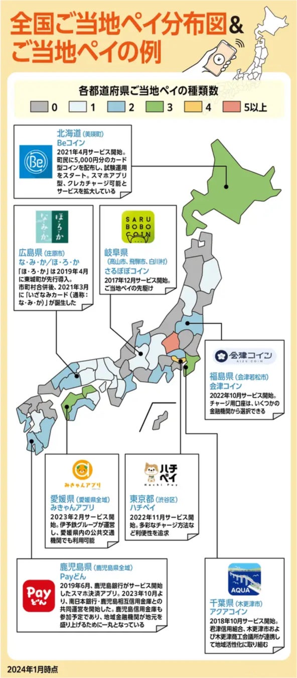 2024年1月時点で、全国のご当地ペイは約60種類(編集部調査)。運営を検討している自治体等もあるため、今後も拡大することが予想されます。