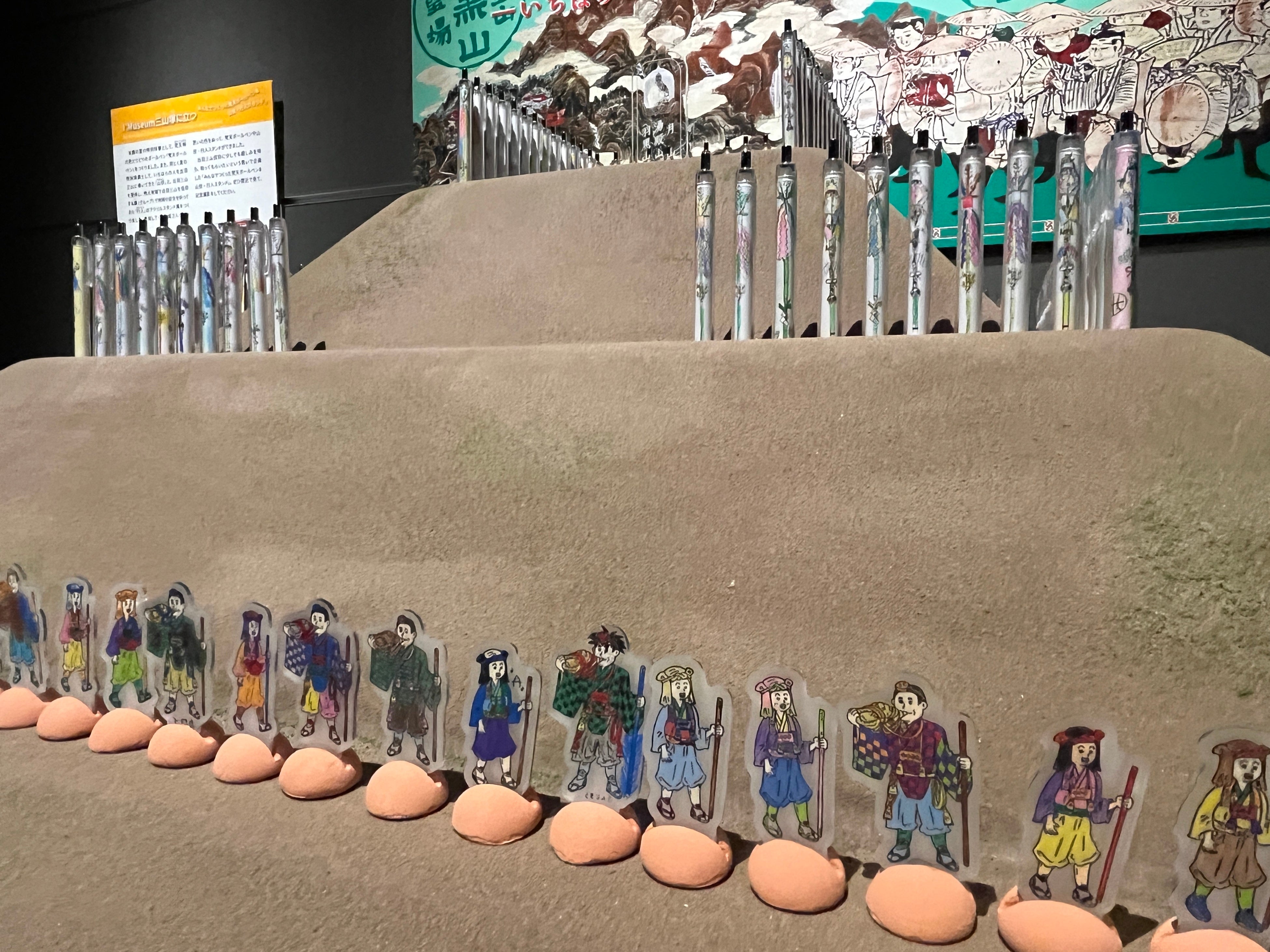 展示室内には、出羽三山供養塚を模した「I’Museum三山塚」のフォトスポットも登場。塚に並んだ「梵天ボールペン」とアクスタ風「山伏・行人スタンド」は、夏休みに来館者とともに思い思いの色を塗ってつくりました。個性あふれる色とりどりの梵天ボールペンと山伏・行人スタンドがずらりと並ぶ壮観なフォトスポットも見どころの1つです。