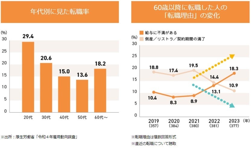 3. 60歳以降の転職理由、「給料に不満がある」は2021年から増加。一方、「倒産/リストラ/契約期間の満了」は減少。2021年に70歳就業法が施行されたことで、企業都合の退職が減少し、給与を理由とした自発的な転職者が増加していると推察される。2022年の厚生労働省の調査では、シニア就業者(60代)の18.2%が転職を経験し、他の世代の就業者と比較すると、30代の就業者に次いで多い水準であった。