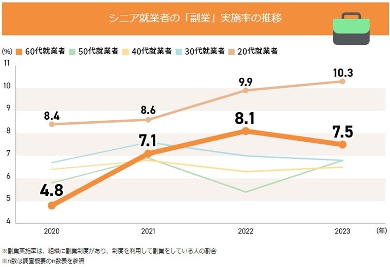 5. 副業をするシニア就業者は、20代に次いで多い。シニア就業者の「副業」の実施率は、2021年以降横ばいで推移し、2023年は7.5%であった。本業が短時間勤務であることが多いためか、シニア就業者の副業実施率は、20代に次いで高い。