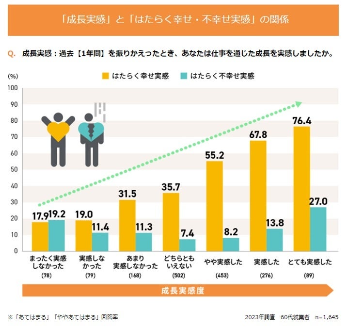 過去1年間で仕事を通じた成長を実感したシニア就業者ほど、はたらくことを通じて幸せを感じている。なお、この傾向は他の年代にも同様に見られる。