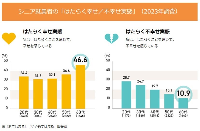 6. 成長を実感しているシニアは、Well-beingに働いている。 シニア就業者は他年代よりも、はたらくことを通じて幸せを感じている割合が46.6%と高く、不幸せを感じている割合は10.9%と低い。