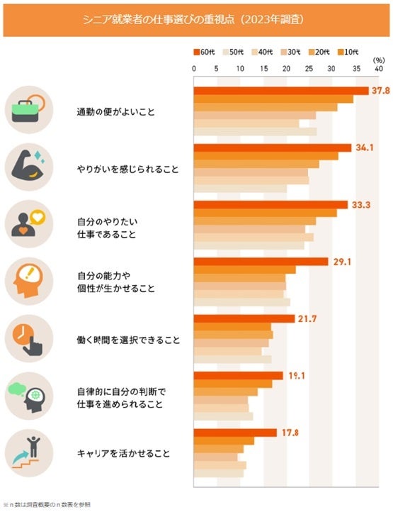 4. シニア就業者の仕事選びの重視点は、「通勤の便」「働く時間を選択できる」。また、「自分の能力や個性を活かせる」「やりがいを感じられる」「自律的に自分の判断で仕事を進められる」など、過去のキャリアを活かして自律的に働くことを希望する傾向。