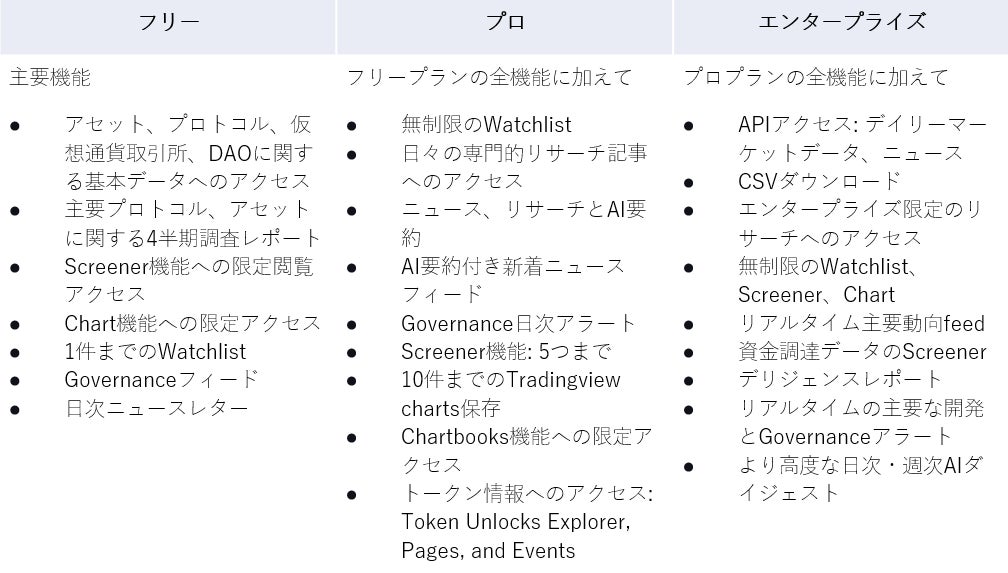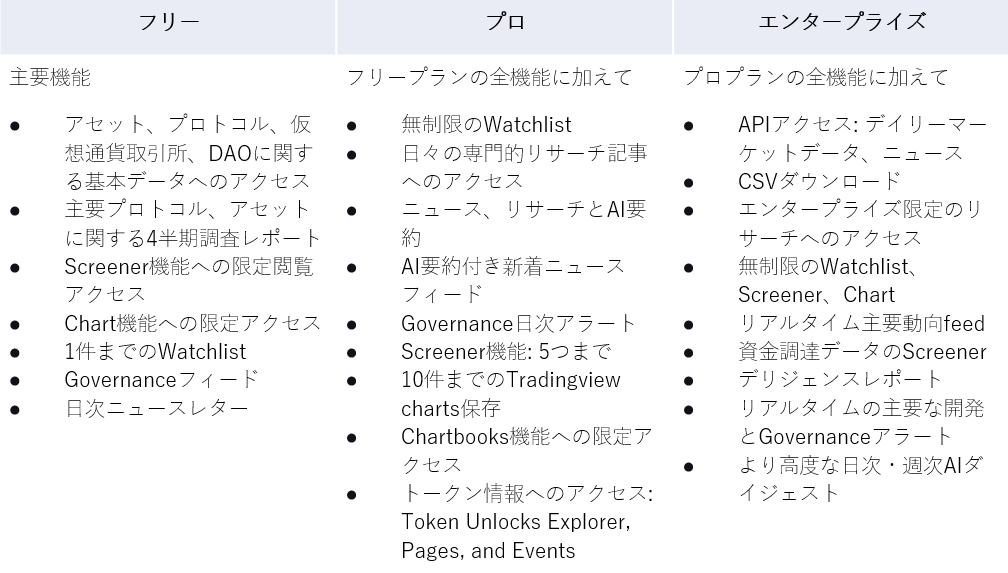 数多くのプロジェクトの詳細や法規制リスク、経済/技術面を解像度高く分析したリサーチレポート。気になるプロトコルやアセットの歴史、構造、特徴を理解する機能。