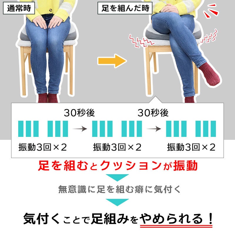 本製品はセンサーを内蔵し足を組むと振動でお知らせするシートクッションです。