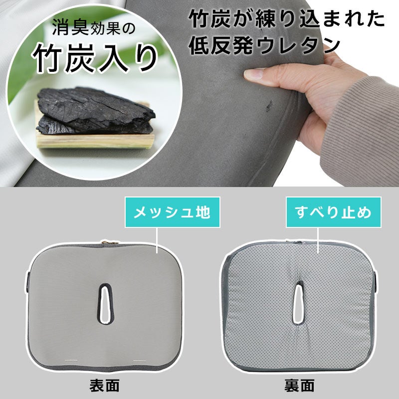 イスに本製品を置き、側面の電源ボタンに触れて電源を入れるだけで準備完了。足を組むと内部のセンサーが反応し振動(振動3回を2回)でお知らせし、足し組みを防止します。また座ってから1時間後にも振動でお知らせし座りっぱなしを防ぎます。低反発素材で座り心地の良い立体形状を採用。素材には竹炭を練りこみ、嫌な臭いを抑えます。