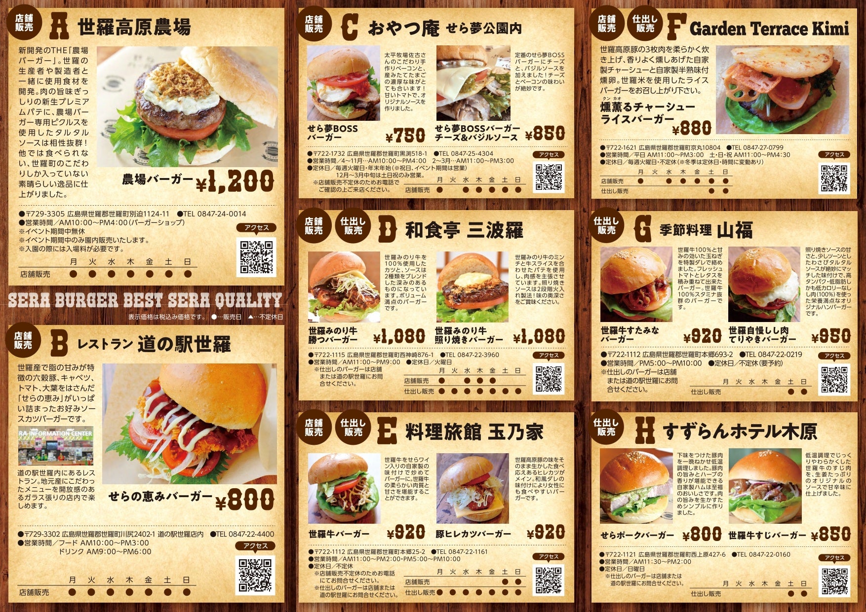進化し続けて七代目となる世羅高原農場の「農場バーガー」のほか、今年は加盟店舗も増え更に進化したせらバーガーです。今回は新規加入店舗のバーガーを中心にご紹介いたします。世羅にお越しの際はぜひご賞味ください。