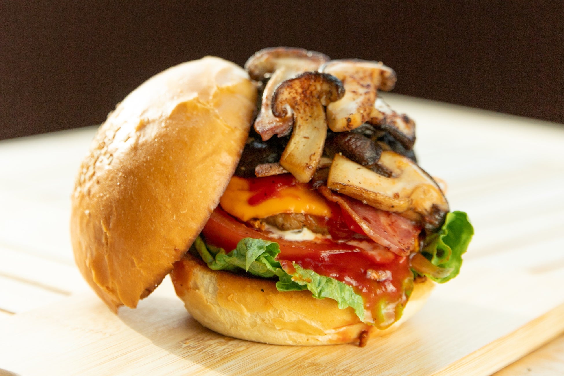 世羅ブランド認定第一号、広島県応援登録商品でもある世羅きのこ園の「松きのこ」たっぷりのバーガーです。その芳醇な香りをお楽しみください。