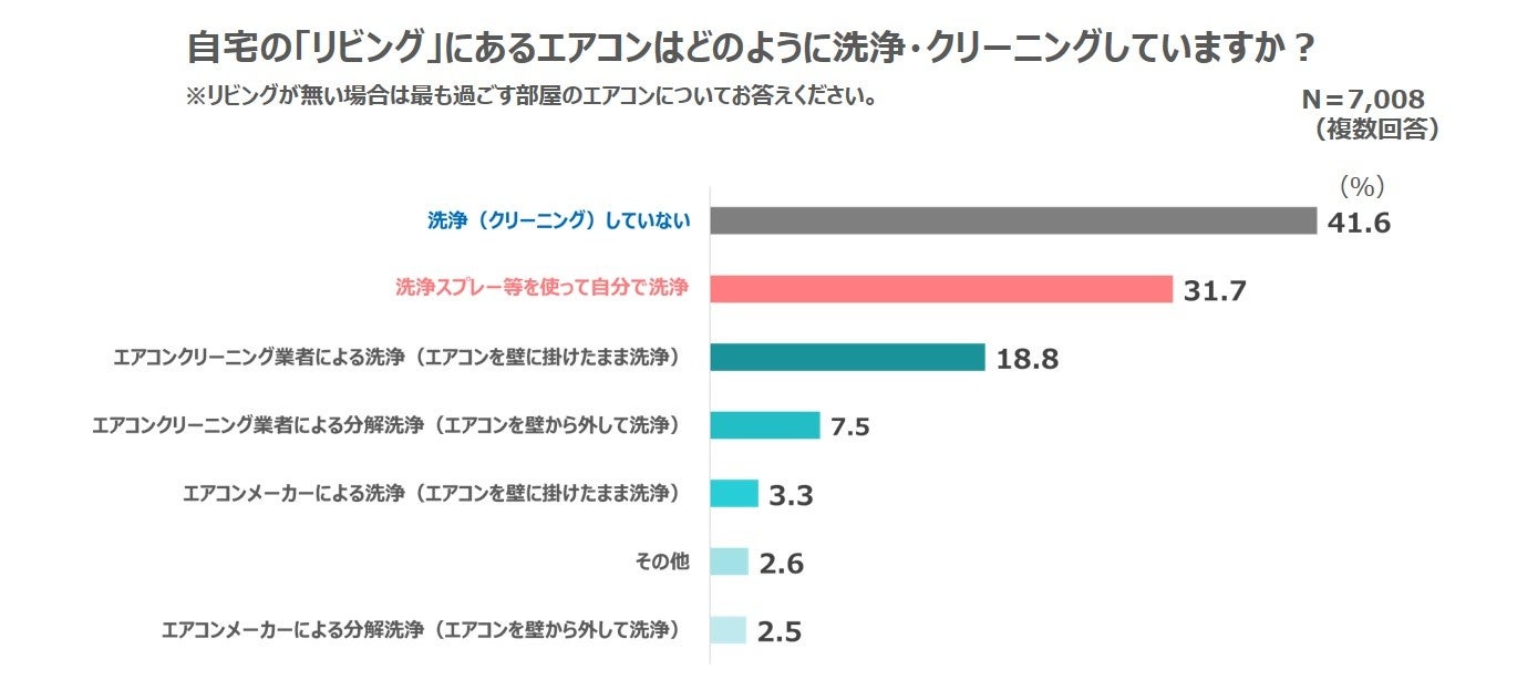 エアコンを効率的で快適に使用し続けるためには、定期的な洗浄・クリーニングが欠かせません。そこで、洗浄・クリーニングについて尋ねたところ、約4割の人が「洗浄(クリーニング)していない」(41.6%)ことが明らかになりました。また、約3割の人が「洗浄スプレーなどを使って自分で洗浄している(31.7%)」こともわかりました。