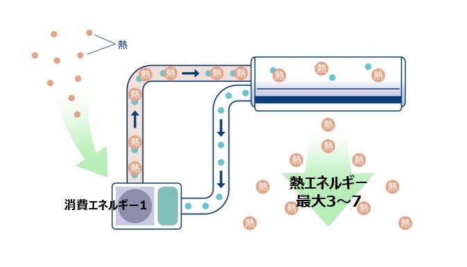例えば電気ストーブは「1」の電力で最大「1」の暖房能力しか得られないのに対し、ヒートポンプエアコンは空気がすでにもっている熱を活用するため、「1」のエネルギーで最大約「3~7」倍のエネルギーを生み出し効率的に暖房をすることができます。このように、すでにある熱を集めてより大きなエネルギーにして効率的に部屋を暖める点が、エアコン暖房の特長です。※参考:一般財団法人ヒートポンプ・蓄熱センター WEBサイト