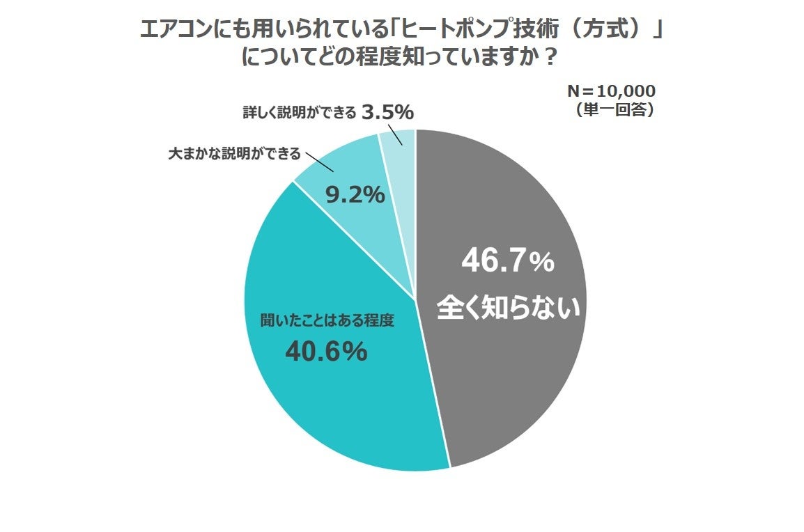 一方で認知度はまだ低く、「ヒートポンプ技術についてどの程度知っていますか」と尋ねたところ、「全く知らない」と回答した人が過半数に迫る結果となりました。