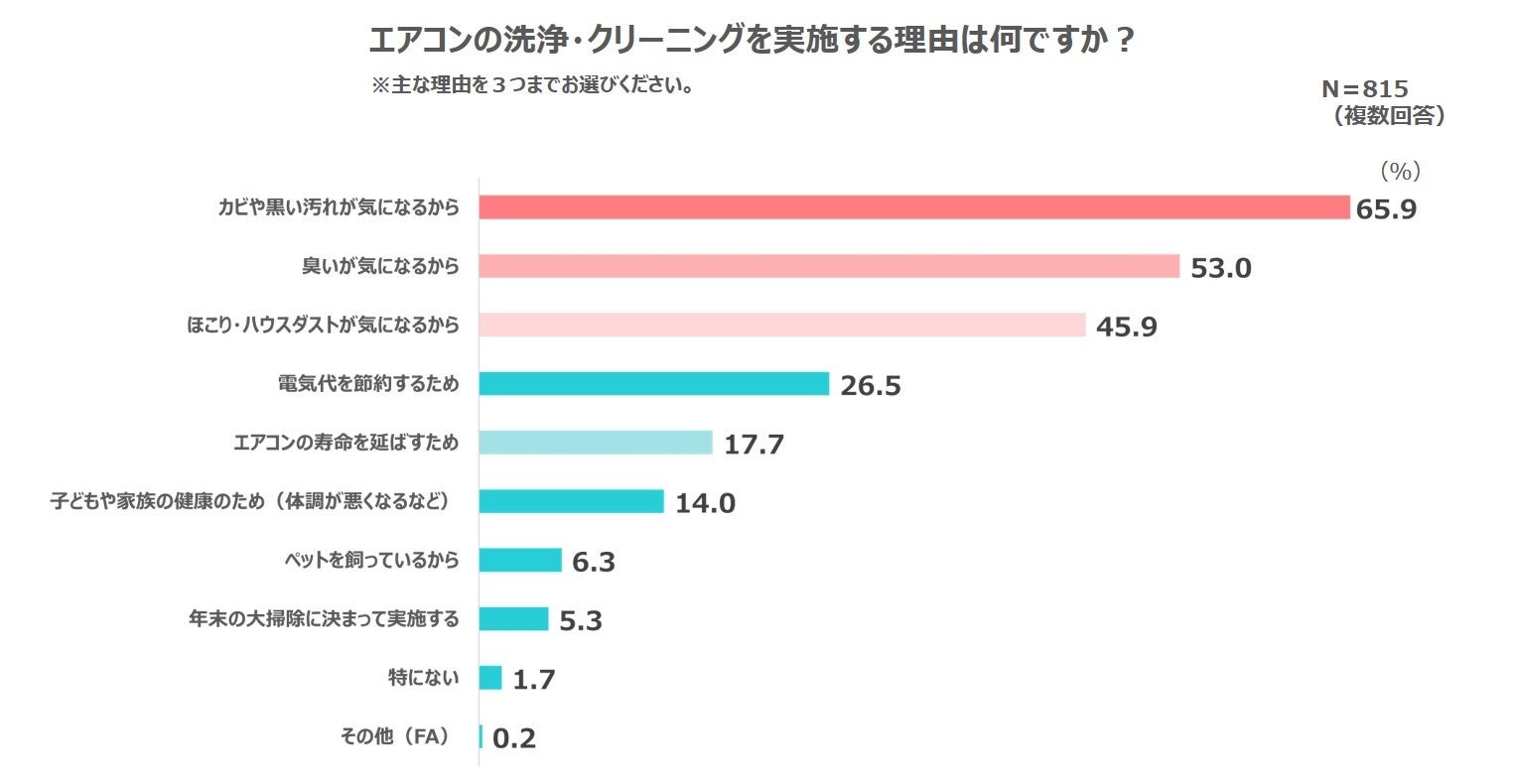最後に、エアコンの洗浄・クリーニングを実施する理由を尋ねたところ、最も多かった回答は「カビや黒い汚れが気になる」で、次いで「臭いが気になる」、「ほこり・ハウスダストが気になる」でした。このことから、多くの人がエアコンにより室内の空気が汚れることを避けたいと考えていることがわかりました。