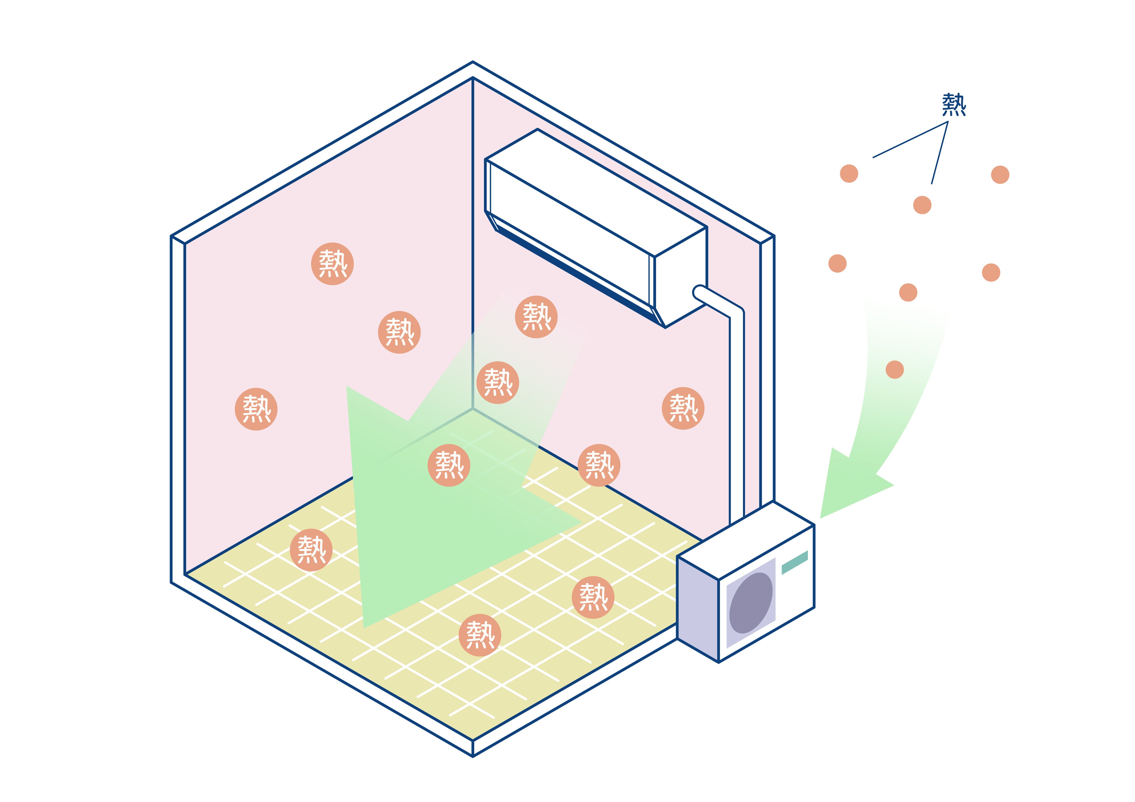 ヒートポンプエアコンは、室外の空気の熱を集め、室内に移動させることで部屋を暖めます。室外の空気から集められた熱を冷媒に取り込み、その熱を冷媒によって移動させます。熱を取り込んだ冷媒を室外機内のコンプレッサーで高温・高圧にすることで、効率よく熱を室内機まで移動させ、部屋を暖めます。