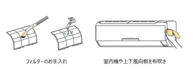 お手入れを行い、エアコンが本来の性能を発揮できる状態にすることで電気代の抑制にもつながります。フィルタ-が汚れている場合は、掃除機でほこりを吸い取るか、水洗いして日陰でよく乾かしてください。また、室内機や上下風向板の汚れは、水かぬるま湯を含ませた柔らかい布でふき、その後やわらかい布でからぶきしてください。