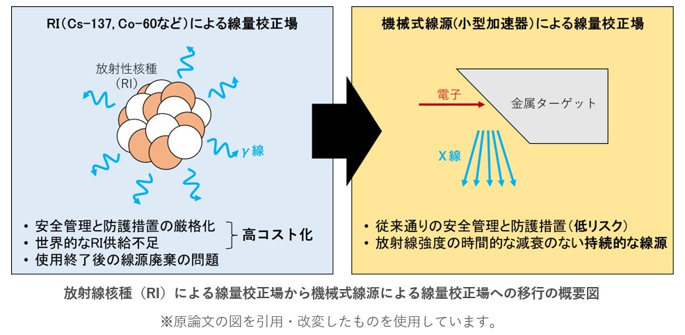 X線などの放射線は医療、工業、原子力などのさまざまな分野で用いられており、これらの業務に従事する方々の安全を確保するための被ばく線量の管理などに、線量計が利用されています。作業現場での安全管理のためには線量計の応答を正確に校正することが必要です。線量計の応答校正には既知の線量率の放射線場が利用されます。この線量校正場を構築する放射線発生源としては、RI線源と人工的な電場や磁場を用いた機械式線源の2種類があります。γ線の線量校正場は、RI線源のセシウム137(Cs-137)とコバルト60(Co-60)が主に発生源として利用されています。国際原子力機関(IAEA)による核セキュリティ勧告などの国際的な動向を踏まえた法改正により2019年9月1日に施行された「放射性同位元素等の規制に関する法律」では、特定放射性同位元素として指定される高強度のRI線源(100 GBq以上の密封されたCs-137など)は、盗取からの防護のためのセキュリティについて厳しい規定が定められました。これに伴い、防護の要件を満たすための管理費用が増加しており、近年のRI線源の価格高騰と併せて、放射線校正施設の維持が困難となっています。このことは2021年6月に開催された国際度量衡委員会(CIPM)の放射線量に関わる X 線・γ線技術委員会(CCRI(I))でも議論され、世界的な問題になっています。これに対処するには、RI線源に頼らない低コストで運用可能な小型加速器のような機械式線源によりγ線の線量校正場を構築する技術が必要です。