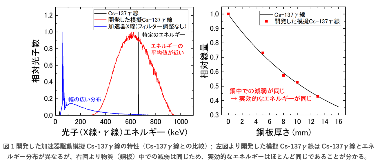 高い線量率のX線場での正確なエネルギースペクトルの実測は測定器の都合上難しいため、X線のエネルギーの測定には、一般的に純金属板中での減弱測定法がよく利用されます。図1 (右)に示すように、開発した加速器X線は、純銅板を用いた際にCs-137からのγ線と同様な減弱であるため、エネルギー分布は異なりますが、実効的にはほとんど同一のエネルギーです。