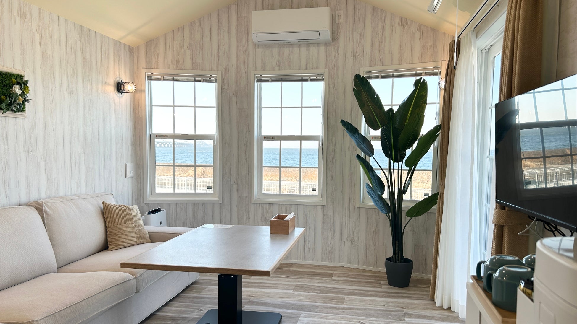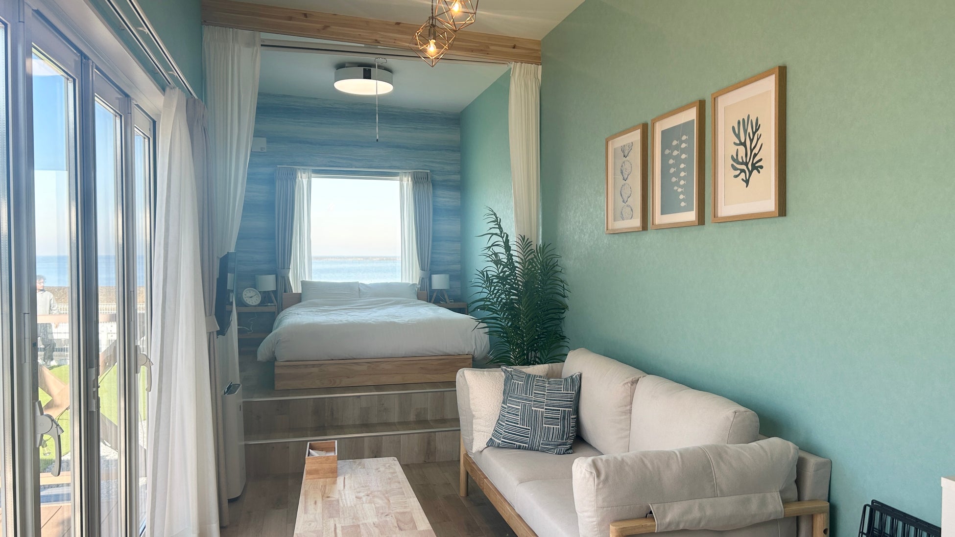 穏やかな海辺の情景をイメージさせ、愛犬とともにゆったりと過ごすのに最適なお部屋
