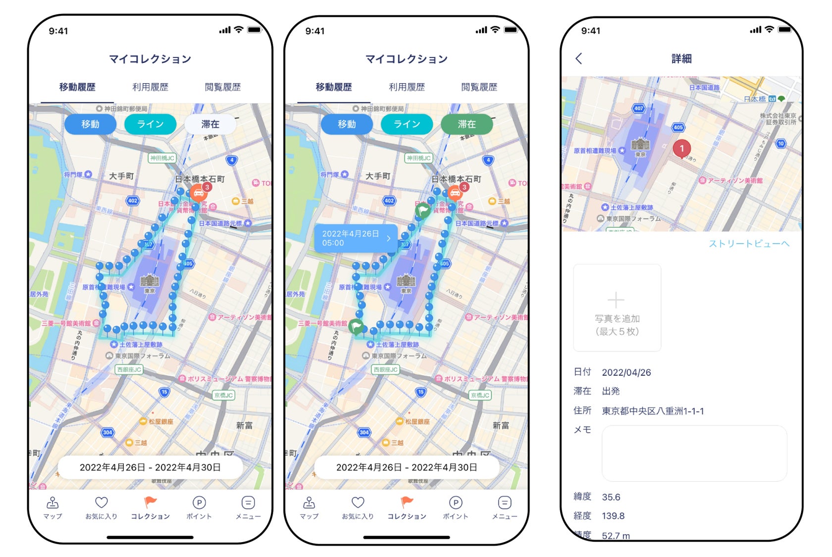 アプリ内の「駐車」ボタンをタップするだけで、その場所にピンが立ち、滞在時間も自動で記録。訪問先を正確にログとして残せるため、記録漏れ防止に役立ちます。