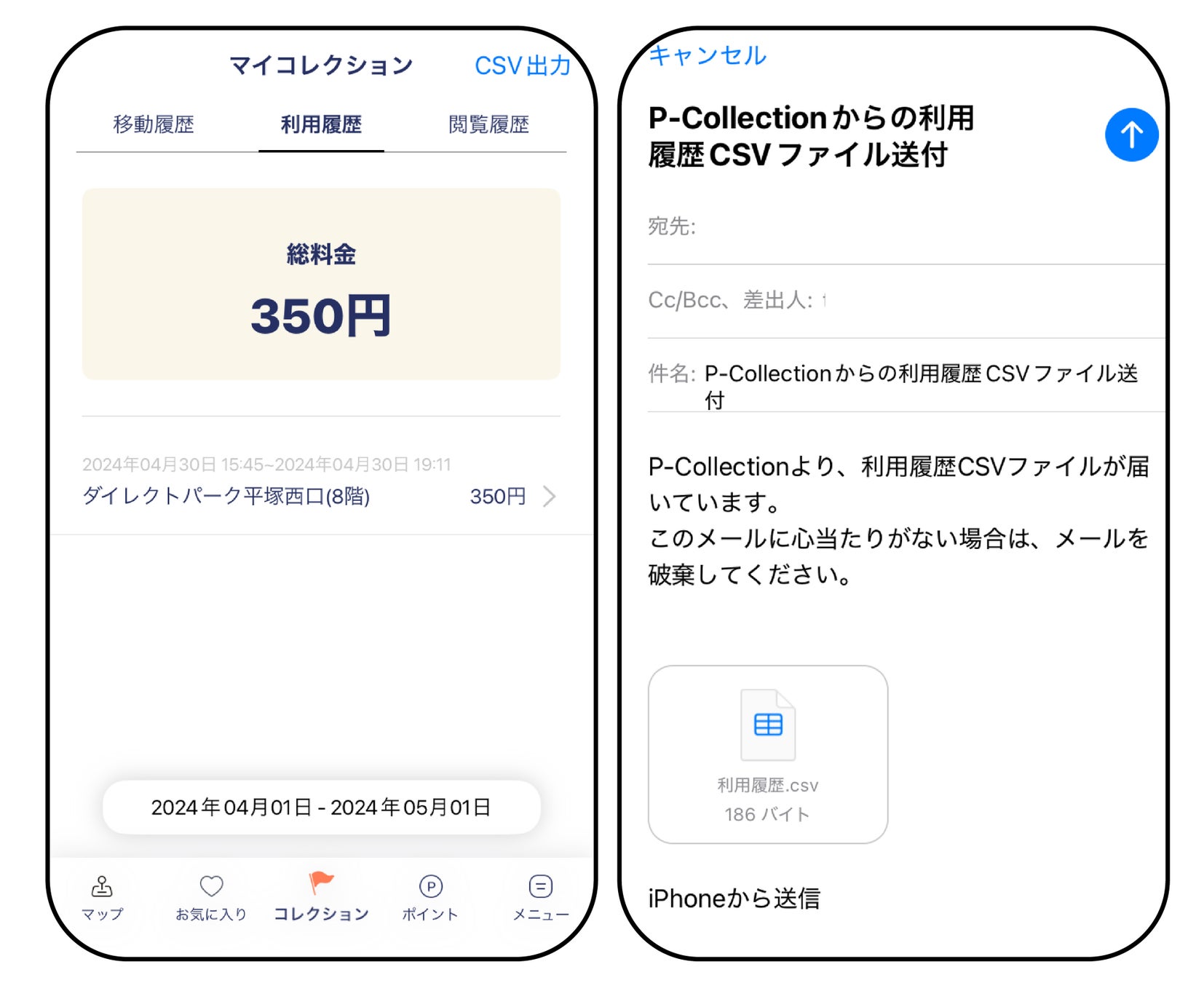 P-Collectionでは、1日〜1ヶ月分の駐車場利用履歴をCSV形式で出力可能。
