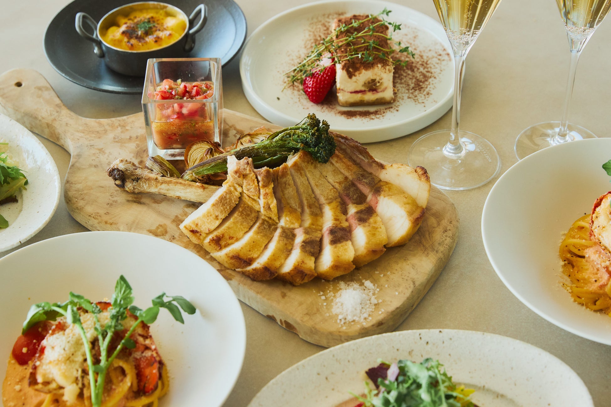 骨付きLボーンステーキを豪快に味わうスペシャルコース。千葉県産の無農薬ハーブを使った爽やかなカプレーゼから始まり、シグネチャーのアジフライ、メインには、豪快に焼き上げた骨付きLボーンステーキで、ジューシーな肉の旨みをご堪能いただけます。最後に、オマールエビの旨みが広がるパスタも楽しめる、満足感のあるラインナップです。